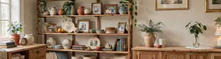 A charming vintage kitchen is shown, filled with wooden furniture, open shelving, and natural light, suitable for lifestyle and home decor advertising.