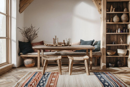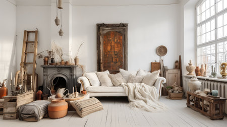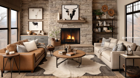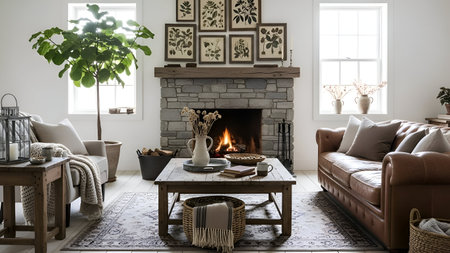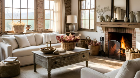 Cozy rustic living room with natural light and earthy decor. That the image is generated using AI.