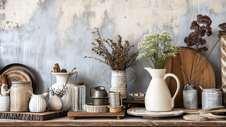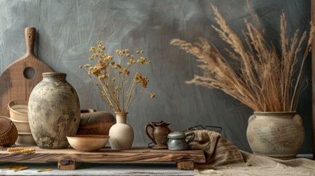 A rustic still life composition featuring pottery, dried flowers, and wooden elements. The earthy tones and textures create a cozy, vintage atmosphere, ideal for home decor and art themes.