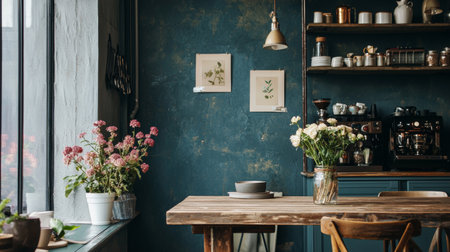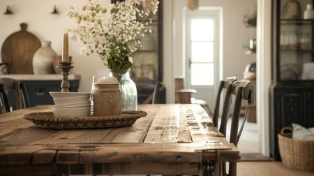 cozy dining space, charming dining area featuring a rustic table, assorted chairs, and a fresh floral centerpiece, ideal for family gatherings and meals