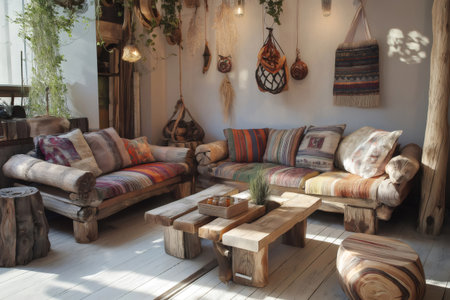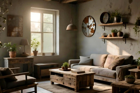 Sunlight illuminating cozy living room with unique furniture crafted from reclaimed wood, showcasing rustic charm and handcrafted decorations