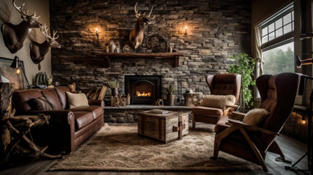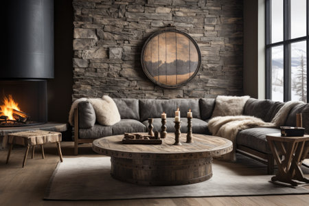 Living room decor, home interior design . Rustic Industrial style with Fireplace decorated with Stone and Metal material . Generative AI AIG26.
