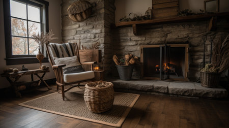 Living room decor, home interior design . Rustic Farmhouse style with Fireplace decorated with Wood and Stone material . Generative AI AIG26.