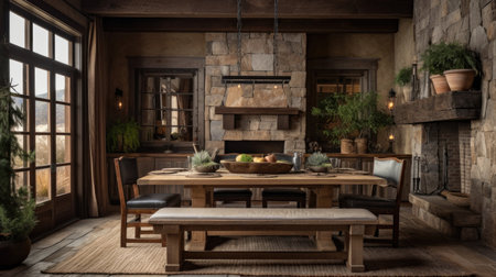 Interior design inspiration of Rustic Industrial style home dining room loveliness decorated with Stone and Wood material and Fireplace .Generative AI home interior design .