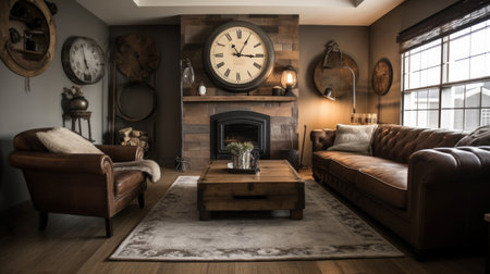 Living room decor, home interior design . Rustic Industrial style with Fireplace decorated with Wood and Metal material . Generative AI AIG26.