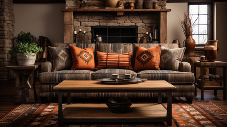 Cozy rustic living room with earthy tones and natural light. That the image is generated using AI.