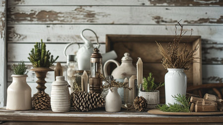 Tabletop display of rustic decorative items for the home, farmhouse interior