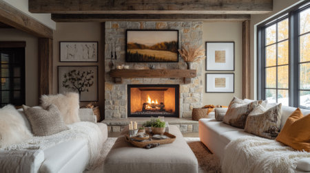 Inviting cabin interior boasts a stone fireplace and snow-covered winter landscape visible through the windows Perfect for home decor and winter lifestyle concepts.