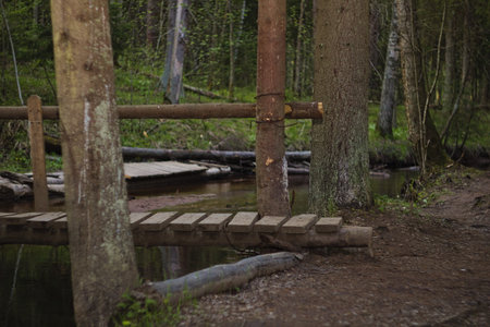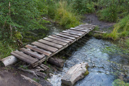 Wooden plank bridge over a small stream in nature