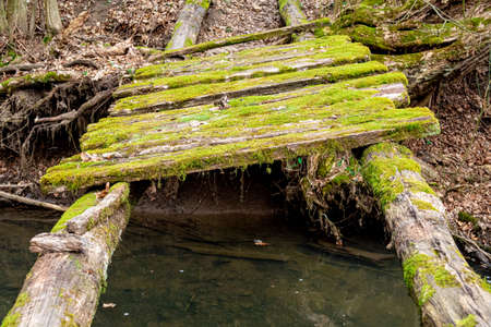 Moss around an old, abandoned wooden bridge