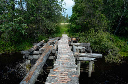 Wooden decayed bridge made of logs in green summer forest