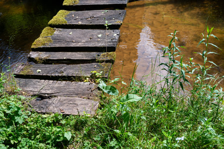 A wooden bridge over a river with moss growing on it. The bridge is old and worn, but it still stands strong. The water below is calm and clear, reflecting the sky above