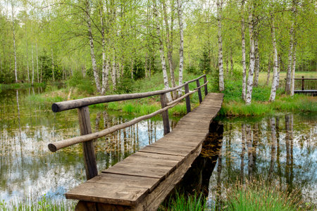 Handmade wood bridge across lake to small island, birch trees growing, calm spring day outdoors.