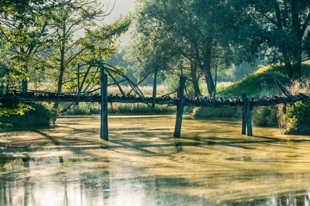 Old wooden bridge across the canal