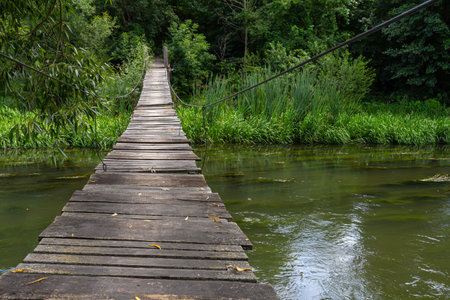 Old suspension wooden bridge across the overgrown river in the village. Countryside landscape