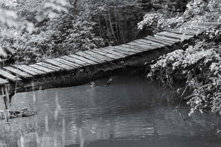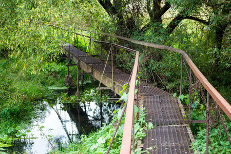 Wooden-iron bridge over a narrow river in the background of the forest