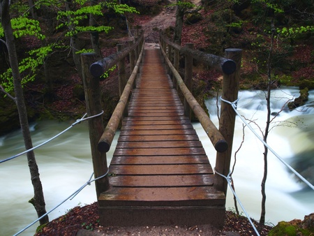 cozy wooden bridge crossing over a stormy mountain river