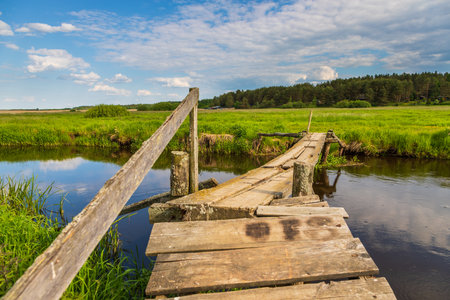Old wooden bridge crosses a calm river near Odrynki village in Poland. Peaceful rural scenery on a summer day.