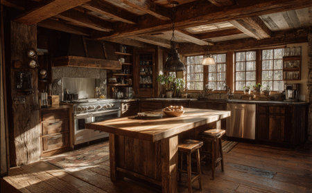 This image showcases a rustic kitchen interior with wooden elements. The space features a large island, a stove, and natural lighting. The composition suggests a warm and inviting atmosphere. It could be used for various purposes, including website design or editorial content.