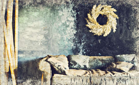 The interior of the room is in the style of ethno. A room lit by light from a window. AI generated.