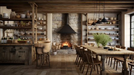 Interior design inspiration of Rustic Industrial style home dining room loveliness decorated with Stone and Wood material and Fireplace .Generative AI home interior design .