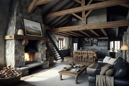 natural stone fireplace and rustic wooden beams in chalet interior, created with generative ai