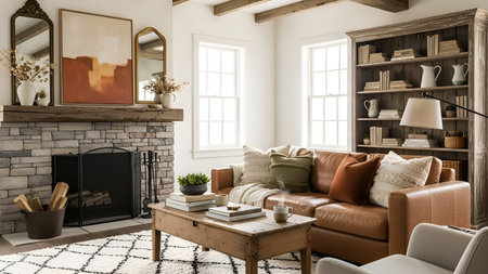 Living room decor, home interior design . Rustic Farmhouse style with Stone Fireplace decorated with Wood and Leather material . Generative AI AIG26.