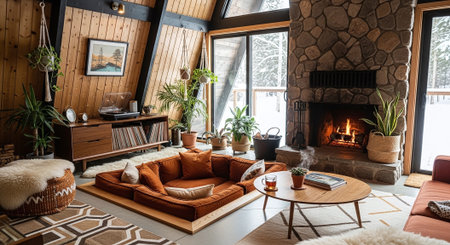 A cozy mid-century modern living room with stone fireplace, large windows, and colorful furniture, featuring plants and decorative items