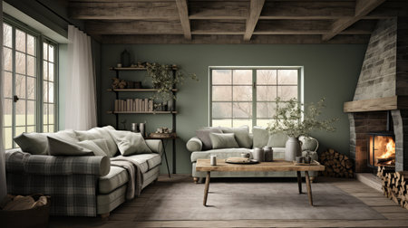 Cozy rustic living room with wooden ceiling and comfortable seating in warm natural light. That the image is generated using AI.