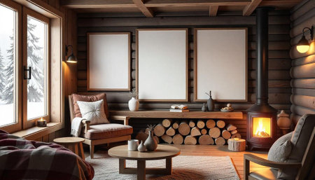 Cozy cabin interior with fireplace and blank picture frames