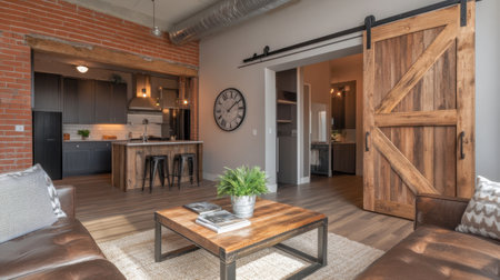 An industrial-style loft with a sliding barn door, revealing a cozy, modern interior filled with natural light.