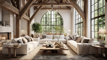 An interior design magazine style photo of the interior of a barn. Generative AI