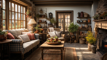 rustic and cottage-style room with vintage accents, exposed beam ceilings and warm lighting, created with generative ai