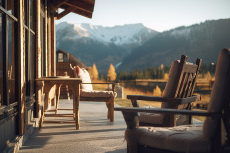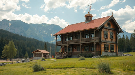 lodge facade highlighting wooden architecture, created with generative ai