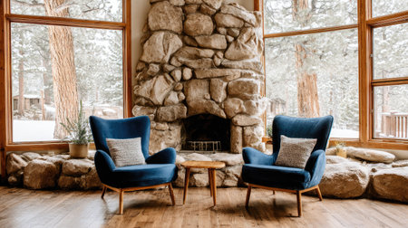 A lodge living room with blue armchairs and a stone fireplace offers a cozy winter view.
