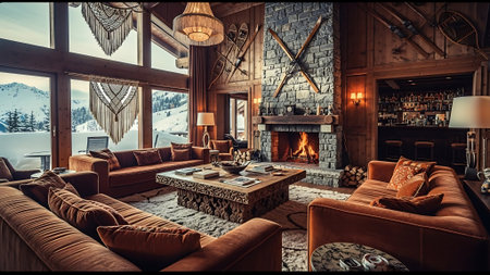 Interior of a luxury chalet with fireplace and wooden walls