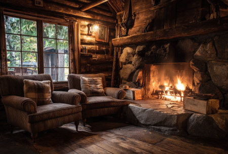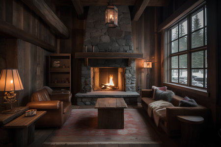 An interior showcases a fireplace with a roaring fire, flanked by armchairs, and a window. The scene is illuminated by warm lighting, creating a comfortable ambiance. The rustic design includes wooden elements and stone accents, suggesting a relaxing setting suitable for editorial or commercial projects.