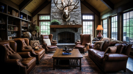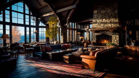 inviting and cozy lodge lobby in a mountain retreat, featuring a stone fireplace, wooden beams, and rustic furnishings. Generative AI