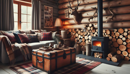 Cozy cabin interior background with warm colors and rustic wood details, evoking comfort and warmth