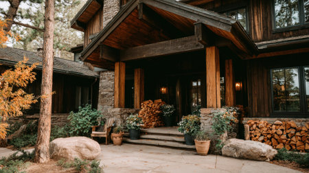 Beautiful rustic house with wooden and stone features, welcoming porch, and vibrant greenery, set in a tranquil environment perfect for relaxation and comfort.