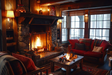Warm and inviting interior with a blazing fireplace, evoking a sense of comfort and relaxation