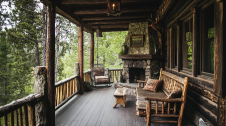 Mountain cabin front porch with rustic wood furniture, stone fireplace and forest view. generative ai
