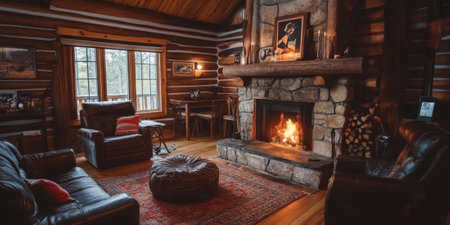 Cozy rustic log cabin living room interior with fireplace