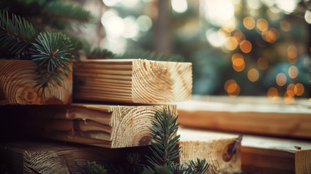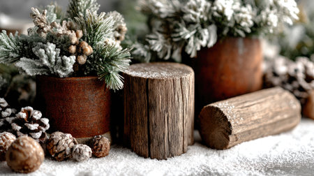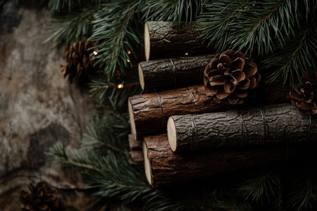 A cozy arrangement of logs and pinecones amidst evergreen branches creates a warm winter atmosphere perfect for seasonal decoration.