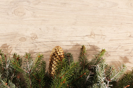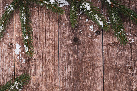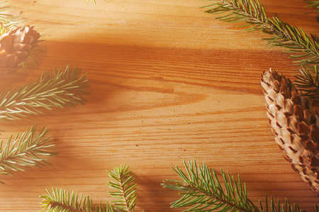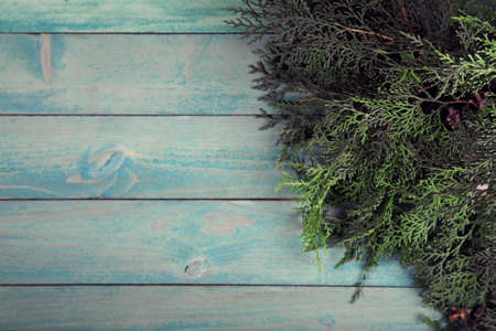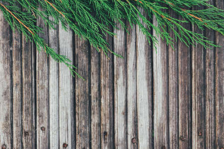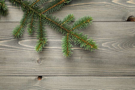Wooden background with branches of a Christmas tree. Concept for Christmas and New Year. Banner. Flat lay, top view.