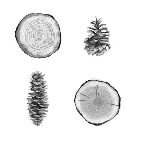 Pine cones and wood slices. Monochrome tree cuts. Watercolour forest details on white bacground.