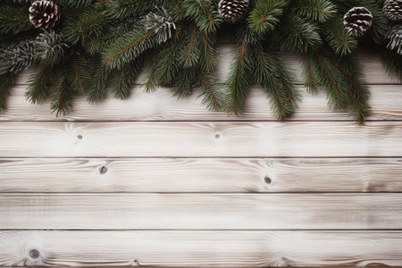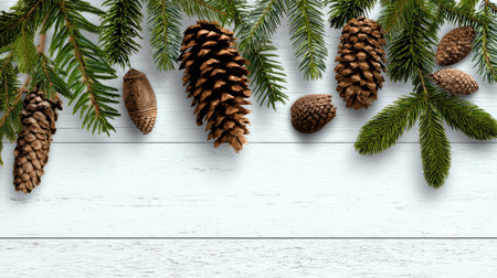 Overhead shot of fir branches and pine cones arranged on a white wooden surface, creating a festive Christmas background.