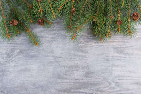 Christmas background with branches of fir, empty copy space, wooden gray backdrop