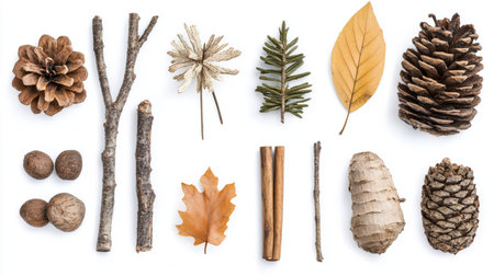 A flat lay arrangement of various natural autumn and forest elements including pinecones, branches, leaves, nuts, and cinnamon sticks, isolated on a clean white background.