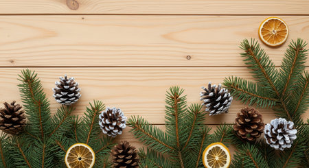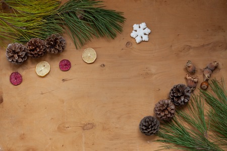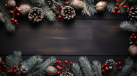 Christmas festive styled floral composition. Pine cones and fir tree branches on wooden board background. Decorative frame, web banner. Flat lay, top view. Copy space.